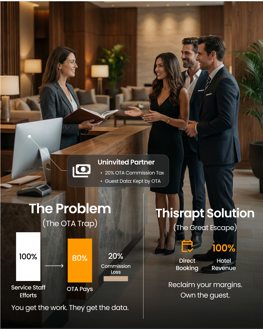 Every booking through an OTA is a guest you don't own, a margin you've surrendered, and a relationship you'll never build. We change that equation permanently.